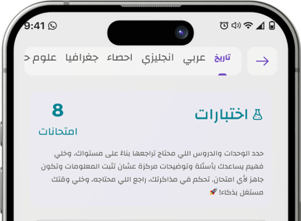 تمارين تفاعلية قصيرة مع محاكاة حقيقية لامتحانات نصف ونهاية العام تخليك تدخل الامتحان بثقة. بنك أسئلة ذكي يغطي كل المواد والمراحل وينمّي مهاراتك. متابعة دقيقة وتقارير تحليلية توضّح نقاط قوتك وضعفك عشان تركز مجهودك صح. وكمان تقارير دورية لولي الأمر تخلّيه متابع تقدمك أول بأول.
